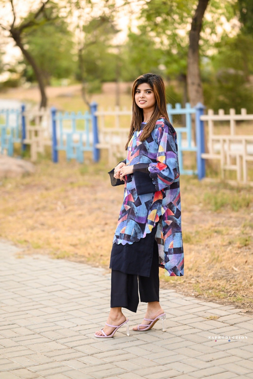 Blue shirt with organza detailing (printed raw silk fabric) + grip trouser